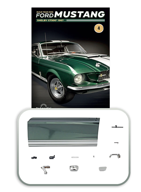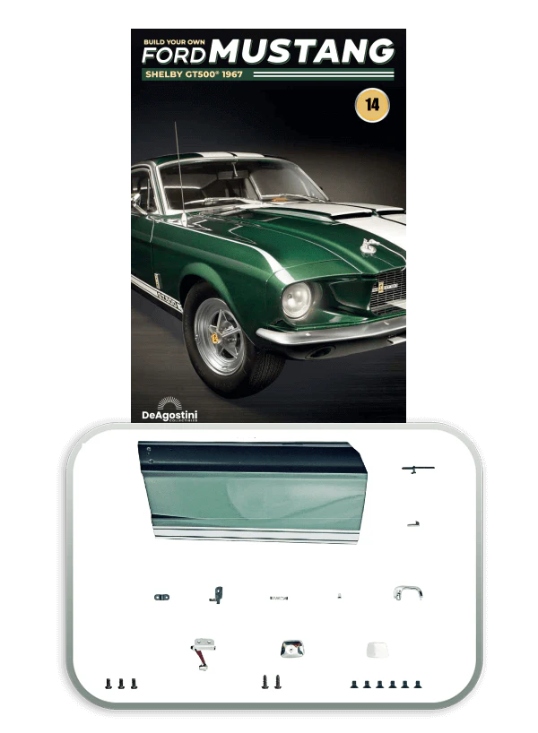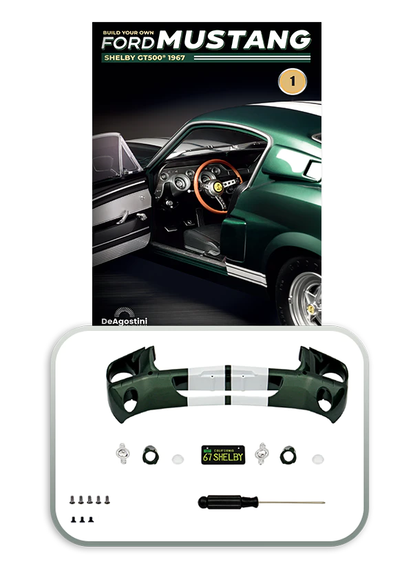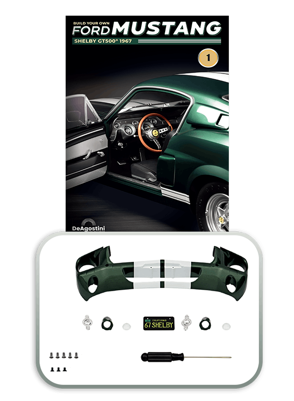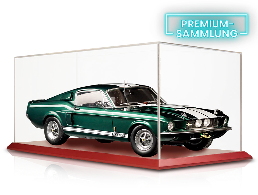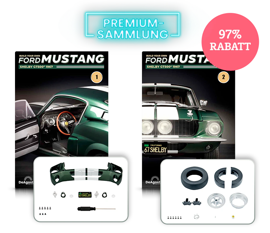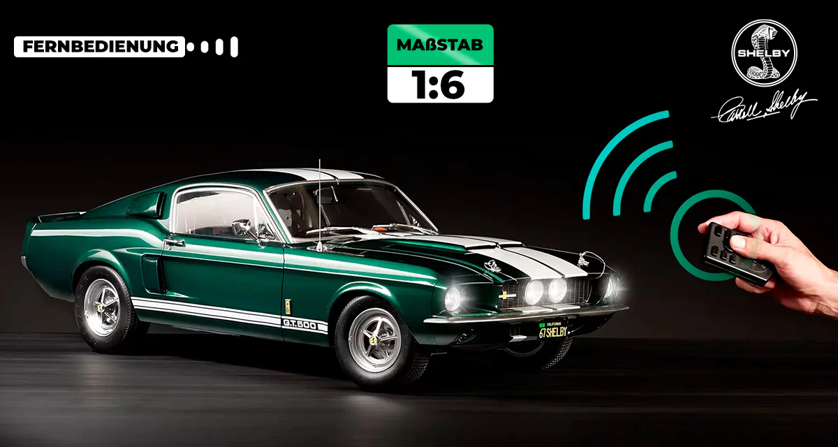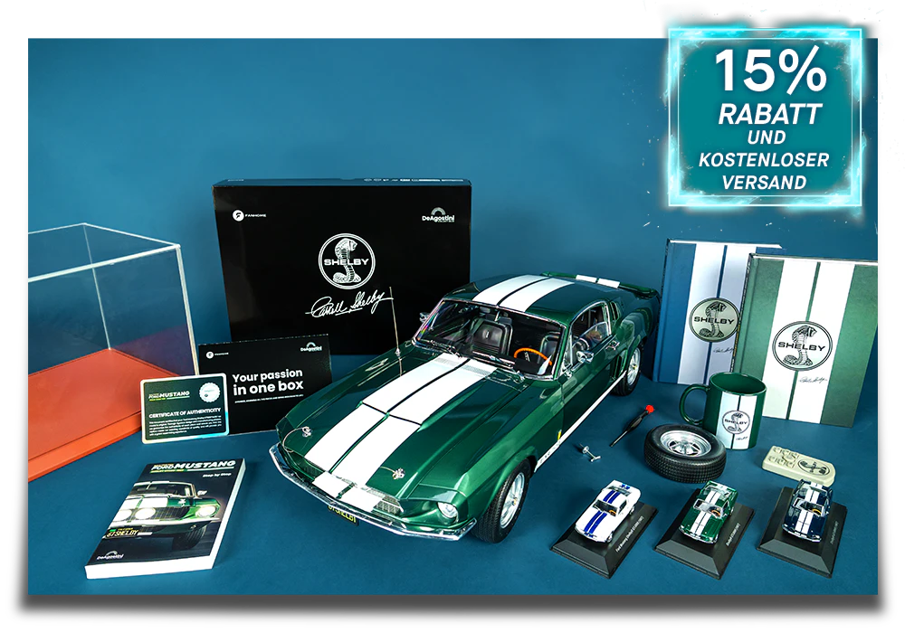 Haben sie jemals Davon Geträumt. einen Ford Mustang Shelby GT500® 1967 zu besitzen? Jezt bietet sich Ihnen die einmalige Gelegenheit. Mehr als 50 Jahre nach seiner Entstehung präsentieren wir diese Reproduktion eines legendären Fahrzeugs im Maßstab 1:6 – ein außergewöhnliches Modell als Hommage an eine längst vergangene Ära. Sie haben die einzigartige Gelegenheit, Schritt für Schritt Ihren eigenen Ford Mustang Shelby GT500® von 1967 zu bauen, der für alle Liebhaber von Geschwindigkeit und Rennsport ein Mythos der Automobilgeschichte ist.
