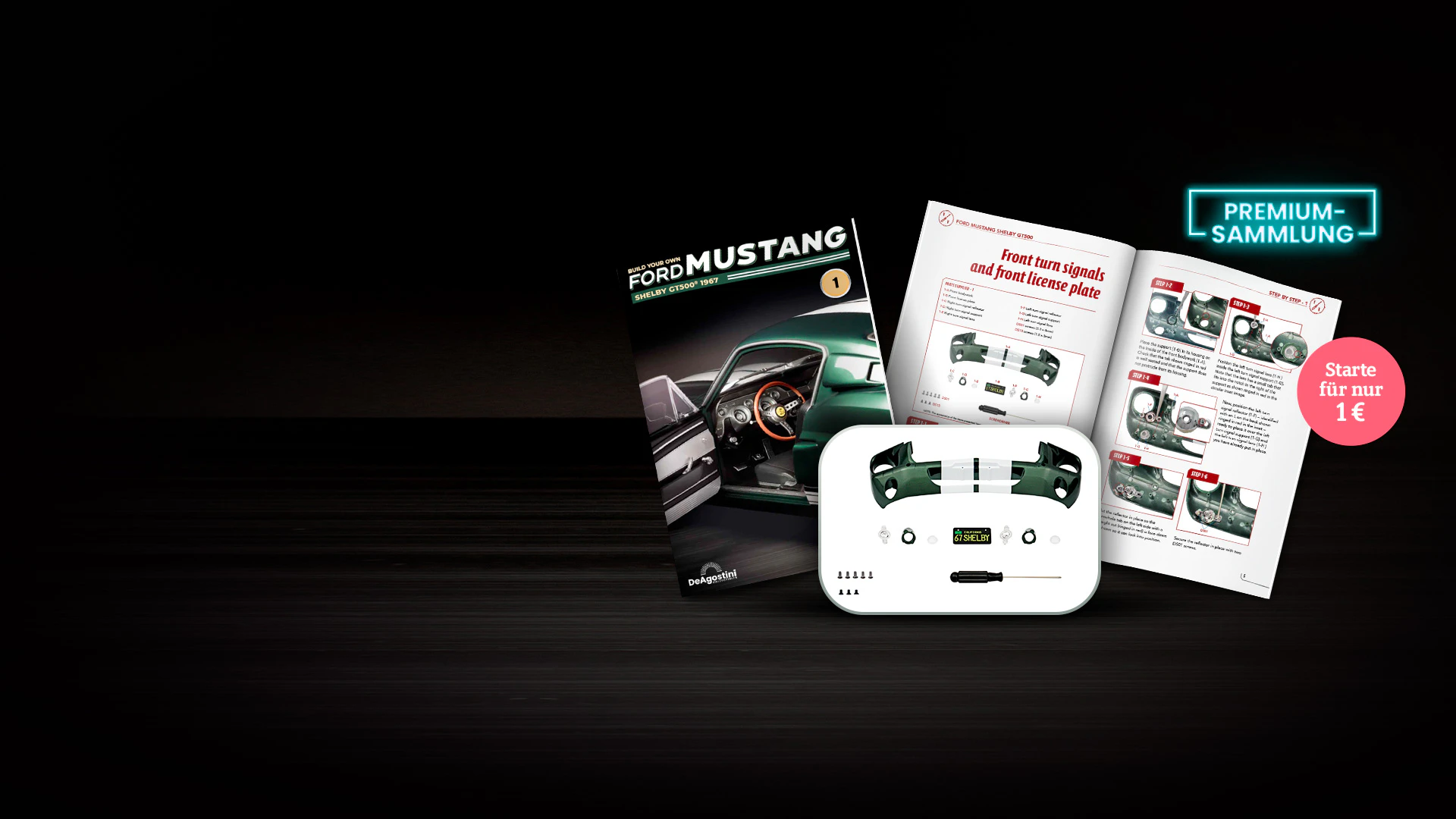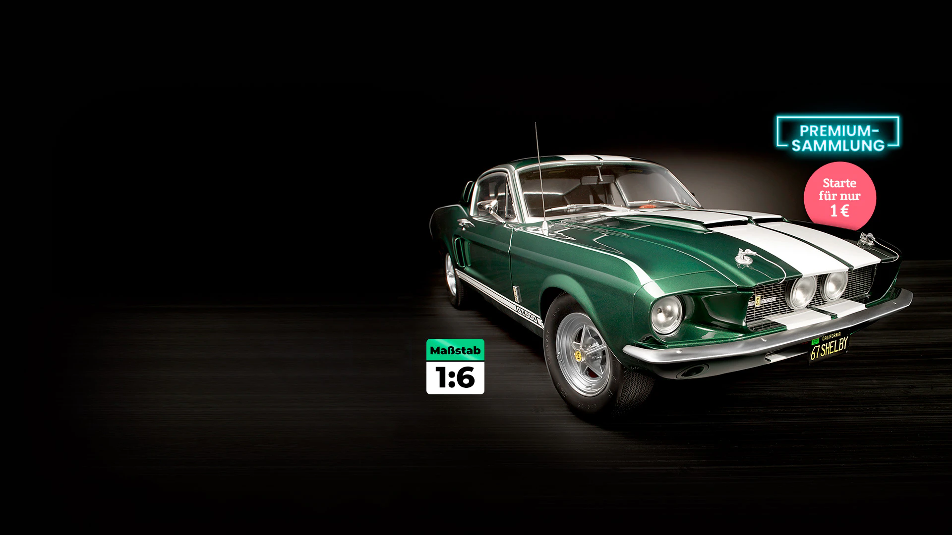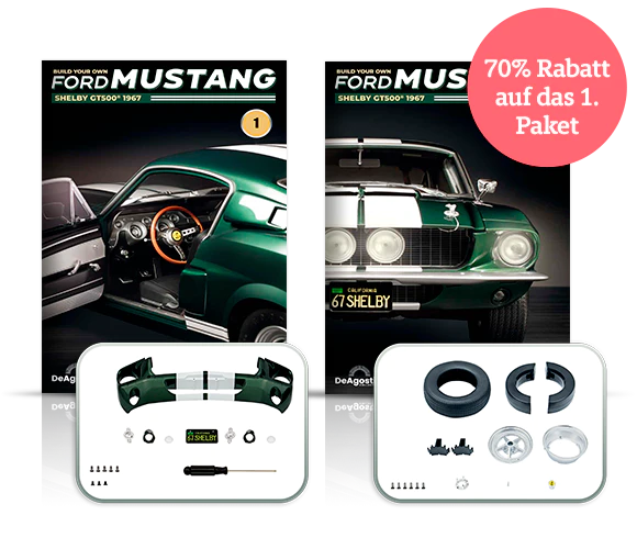 Haben sie jemals Davon Geträumt. einen Ford Mustang Shelby GT500® 1967 zu besitzen? Jezt bietet sich Ihnen die einmalige Gelegenheit. Mehr als 50 Jahre nach seiner Entstehung präsentieren wir diese Reproduktion eines legendären Fahrzeugs im Maßstab 1:6 – ein außergewöhnliches Modell als Hommage an eine längst vergangene Ära. Sie haben die einzigartige Gelegenheit, Schritt für Schritt Ihren eigenen Ford Mustang Shelby GT500® von 1967 zu bauen, der für alle Liebhaber von Geschwindigkeit und Rennsport ein Mythos der Automobilgeschichte ist.