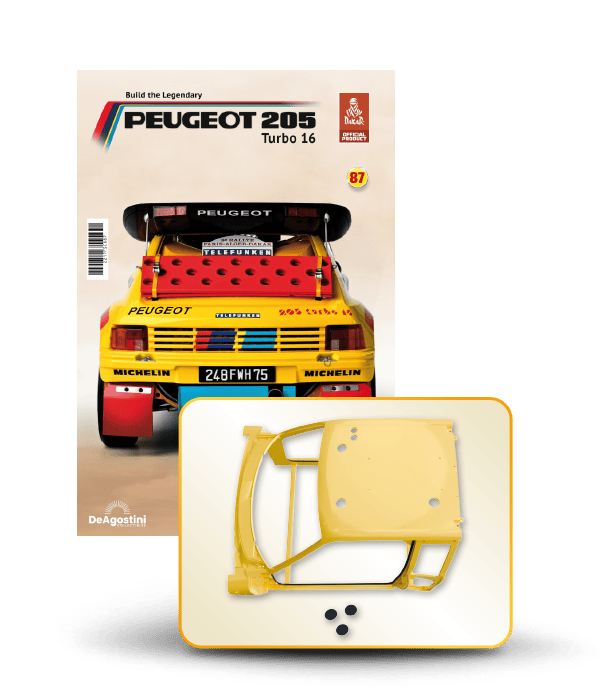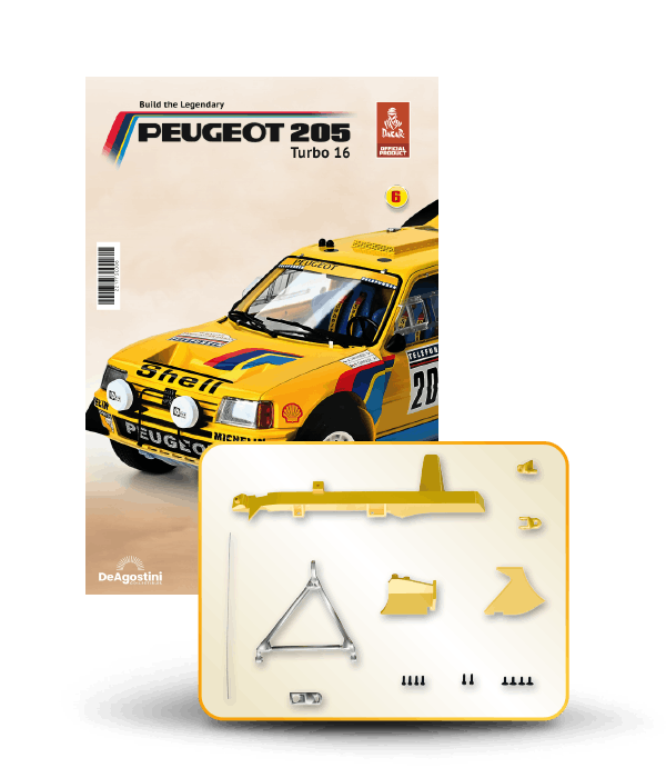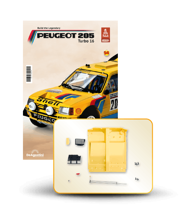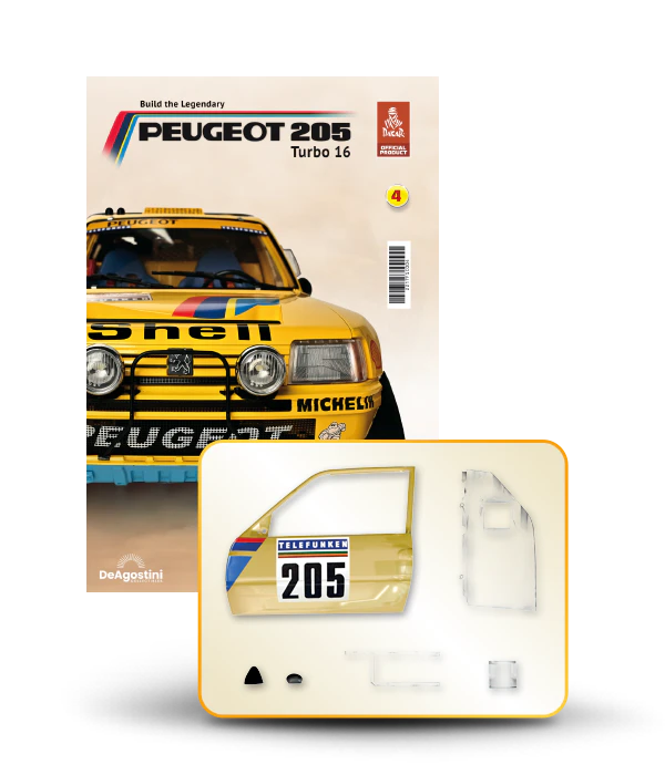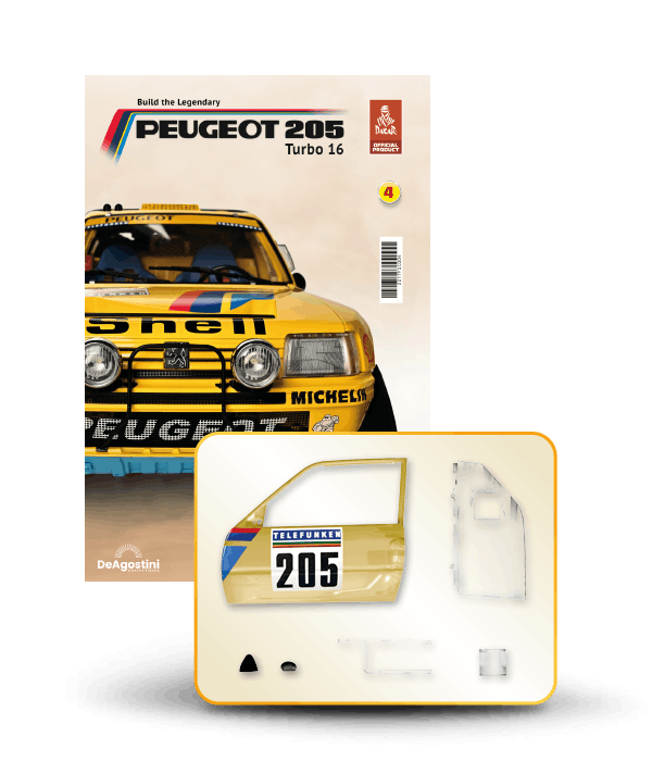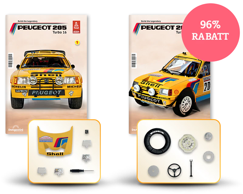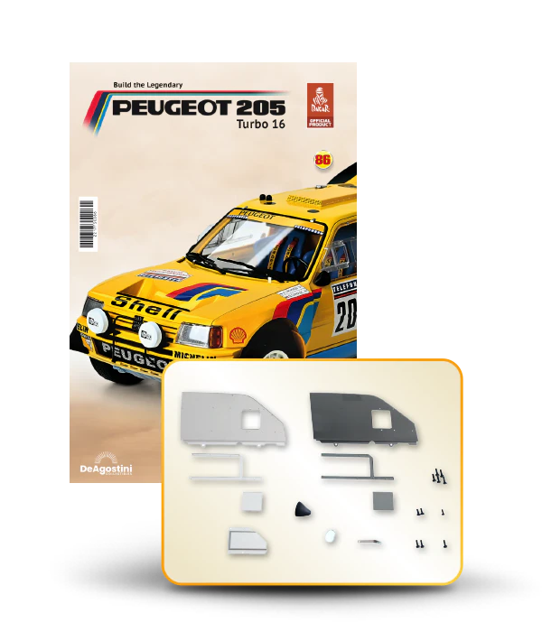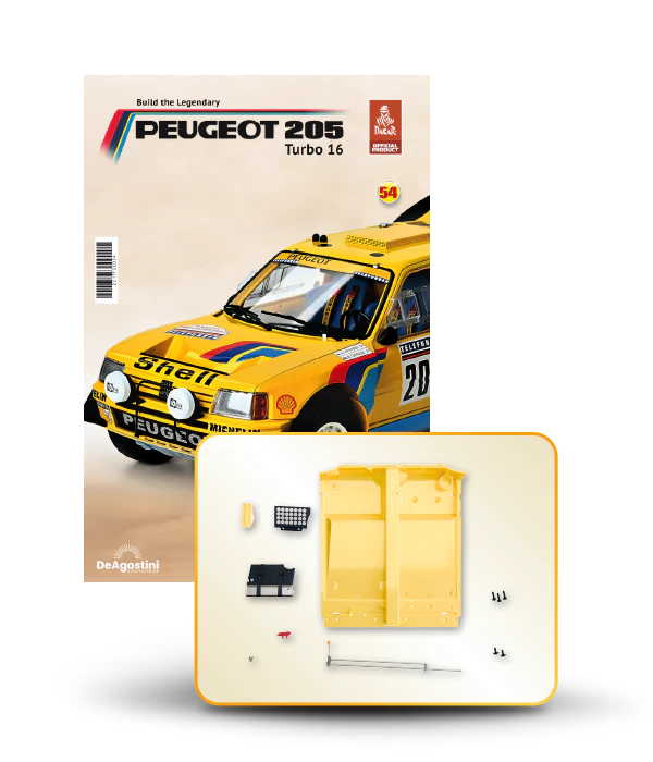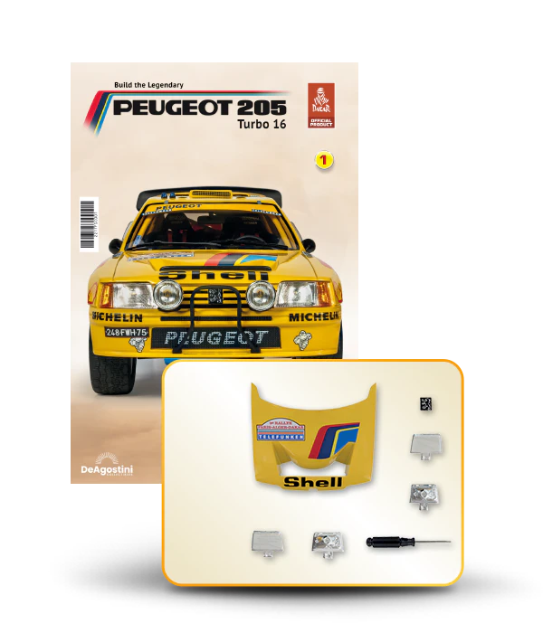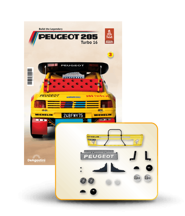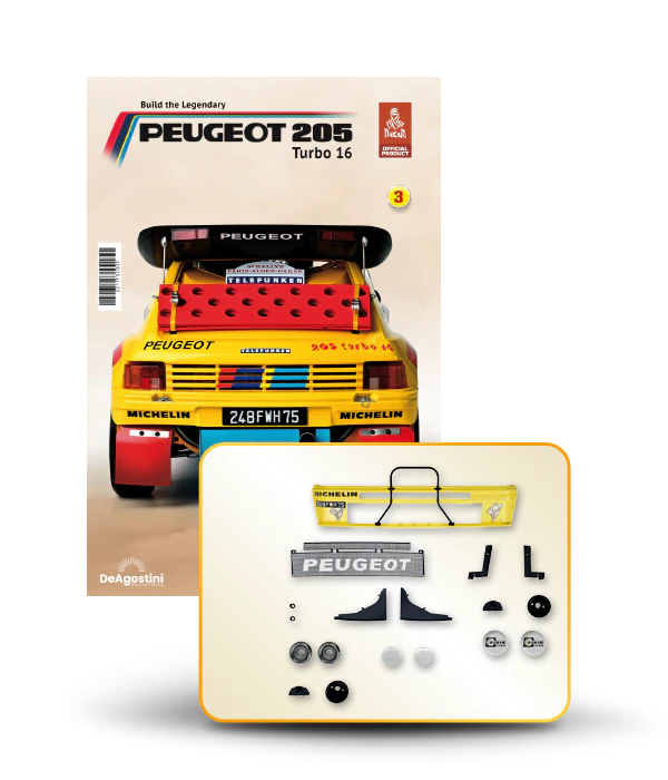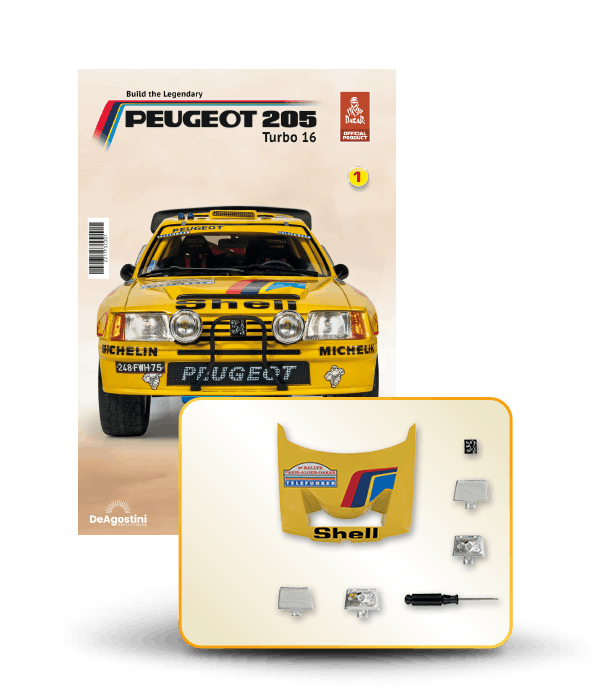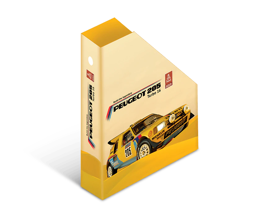 Jetzt kannst du dein eigenes 1:8-Modell des spektakulären Peugeot 205 Turbo 16 Grand Raid bauen, des Rallye Paris-Dakar-Siegers von 1987, wie er von Ari Vatanen und Bernard Giroux gefahren wurde. Dieses bisher noch nie auf dem Markt verfügbare Modell ist ein lange erwartete Neuzugang in der Welt des Modellbaus. Viel Spaß beim Zusammenbauen und anschließenden Ausstellen an einem Ehrenplatz bei dir zu Hause.