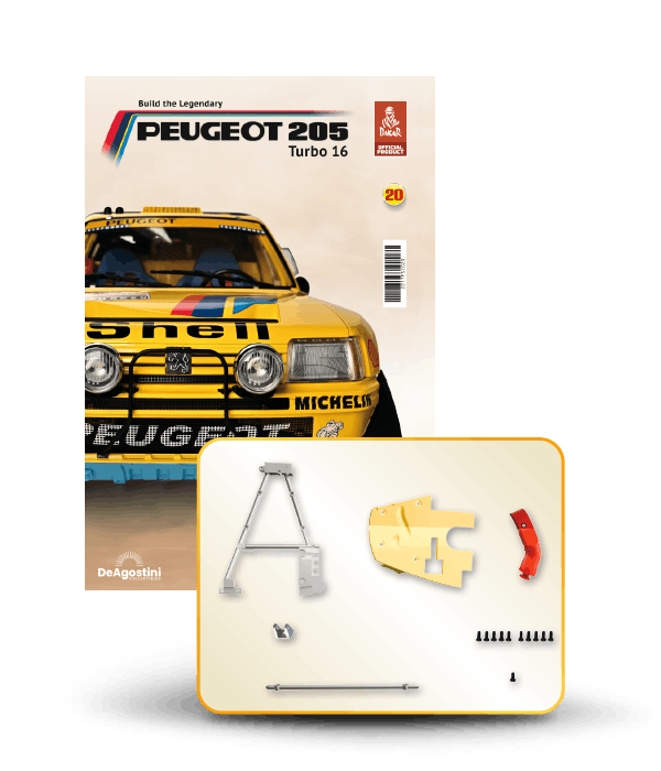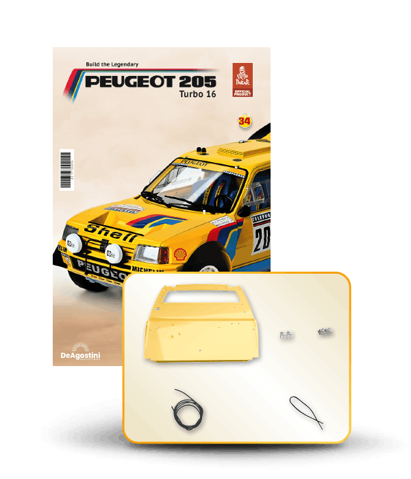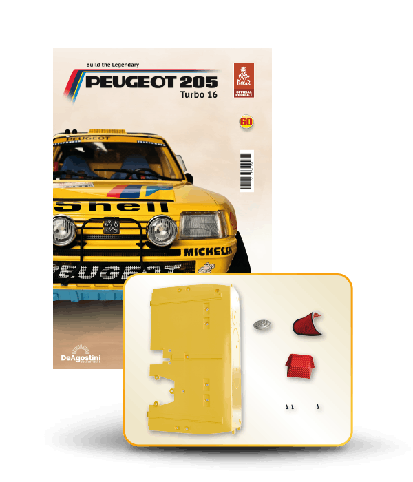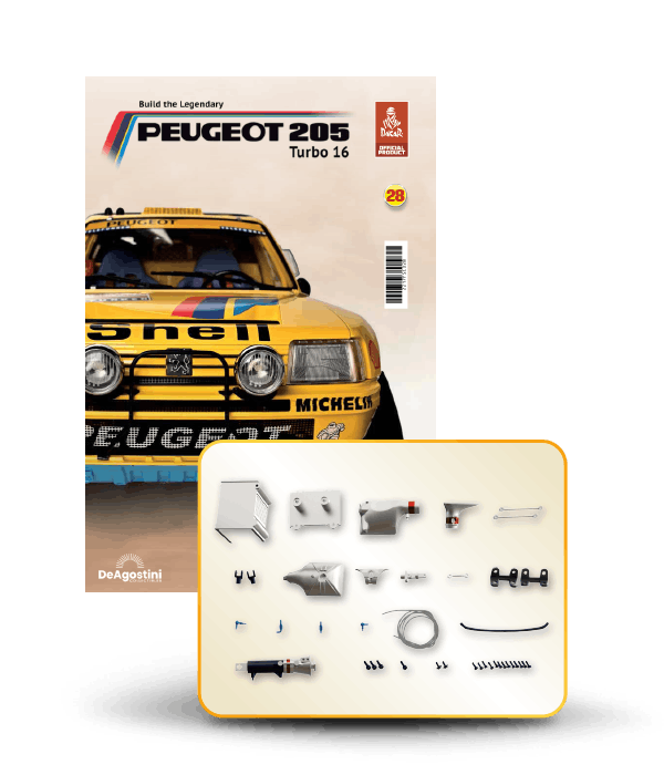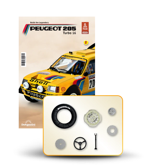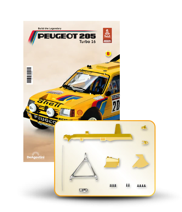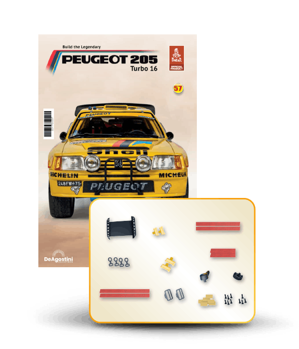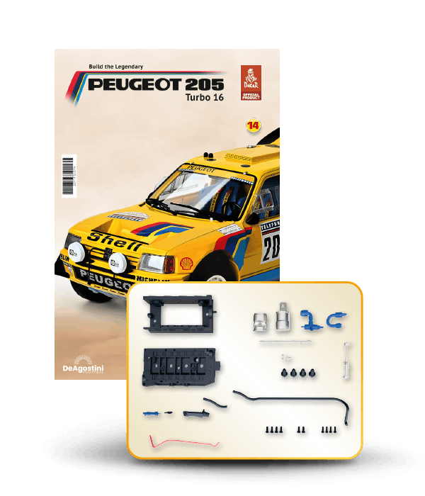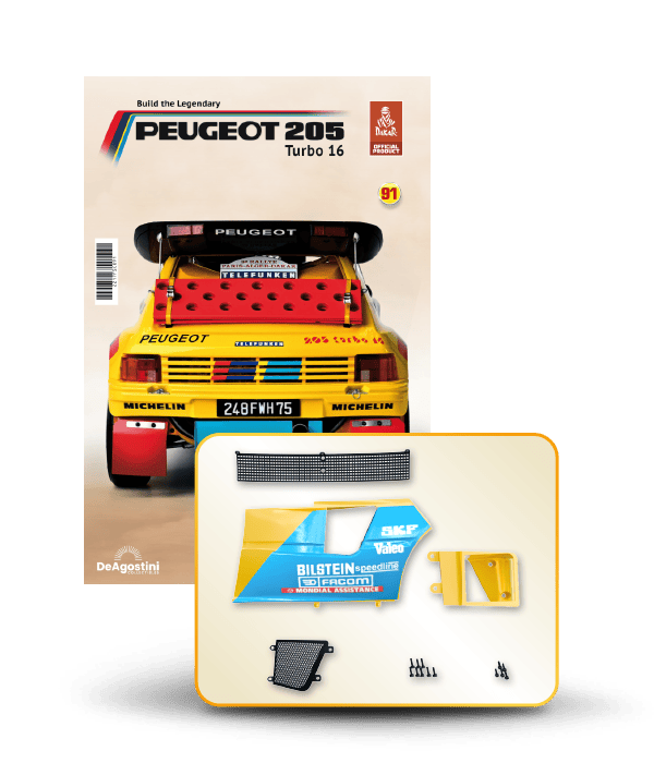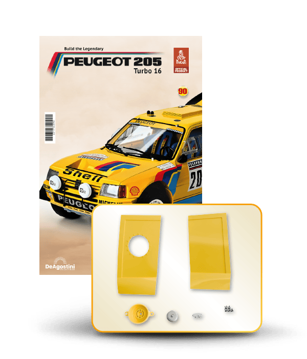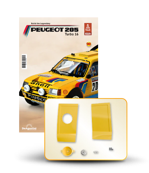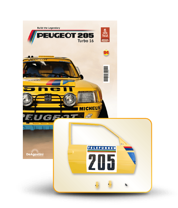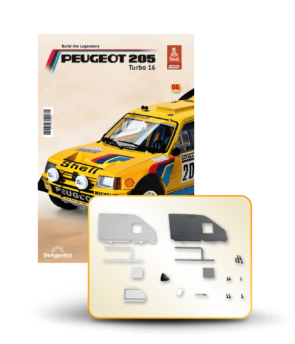 Jetzt kannst du dein eigenes 1:8-Modell des spektakulären Peugeot 205 Turbo 16 Grand Raid bauen, des Rallye Paris-Dakar-Siegers von 1987, wie er von Ari Vatanen und Bernard Giroux gefahren wurde. Dieses bisher noch nie auf dem Markt verfügbare Modell ist ein lange erwartete Neuzugang in der Welt des Modellbaus. Viel Spaß beim Zusammenbauen und anschließenden Ausstellen an einem Ehrenplatz bei dir zu Hause.