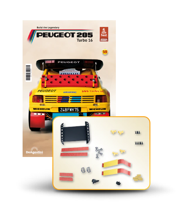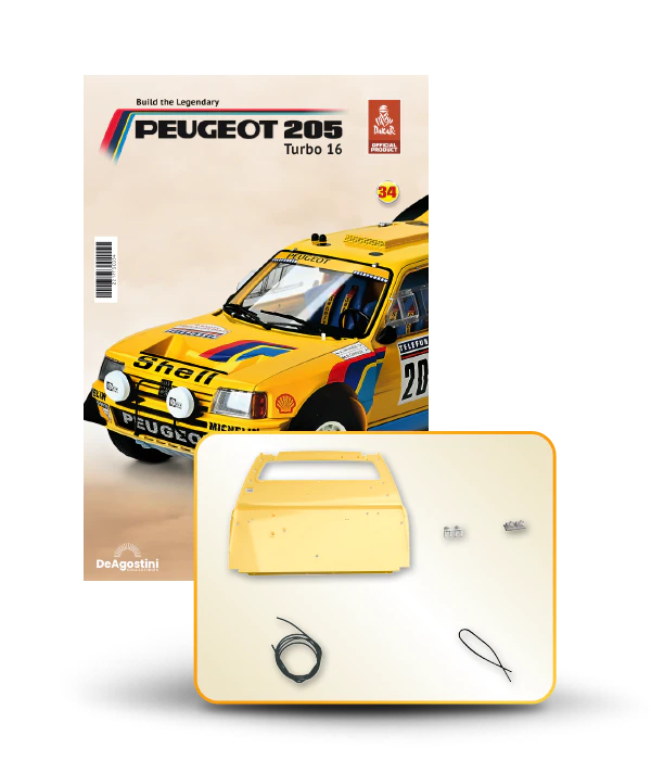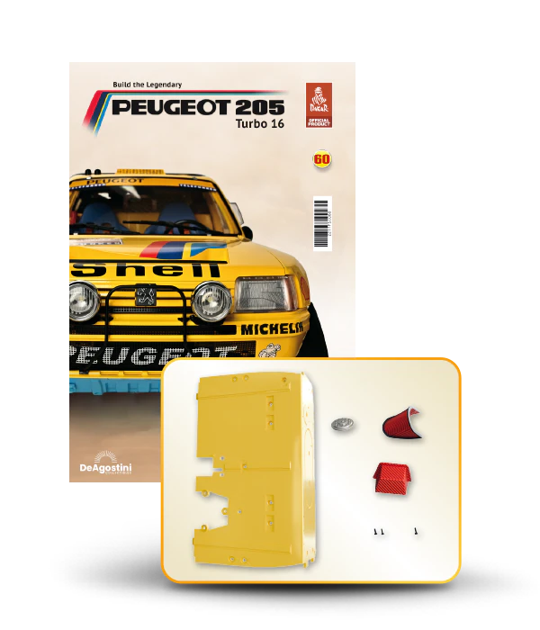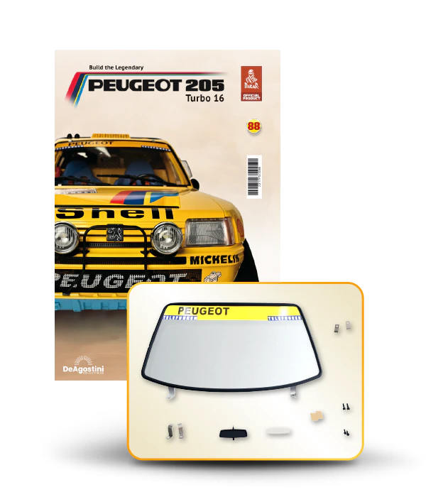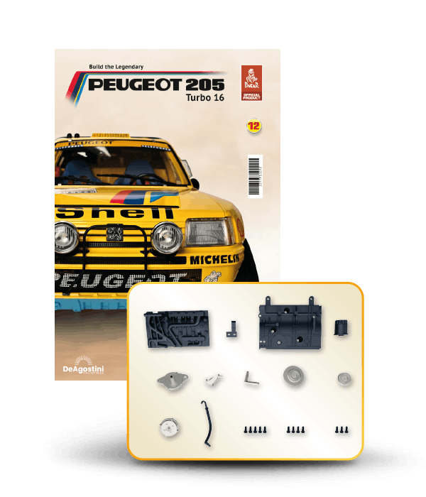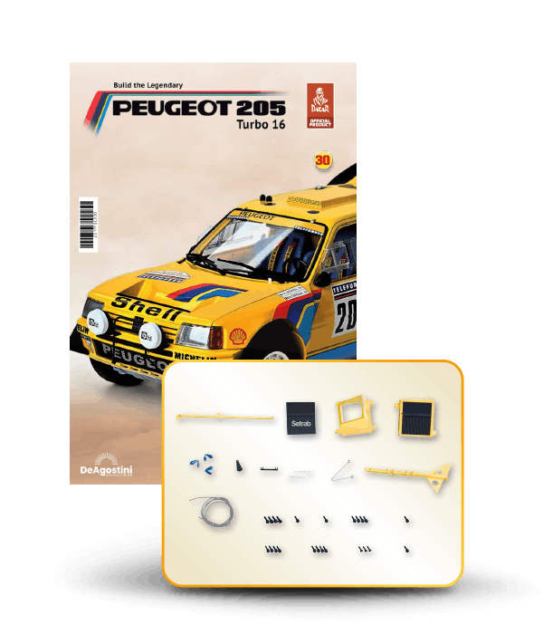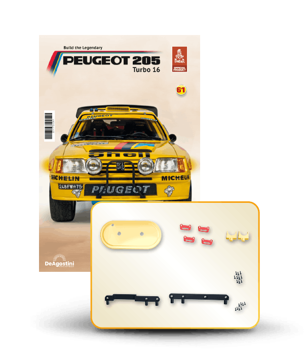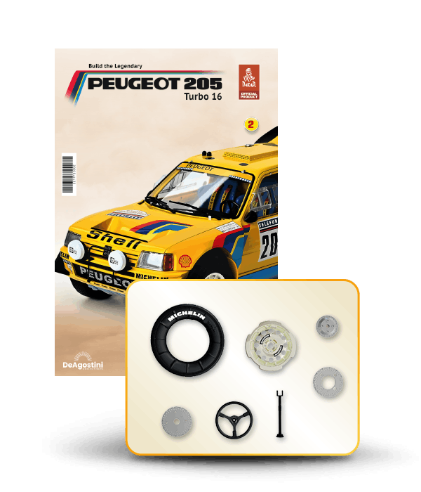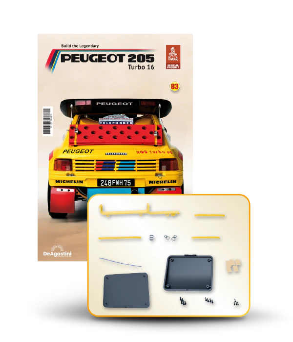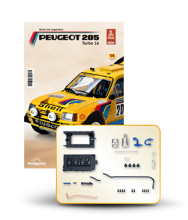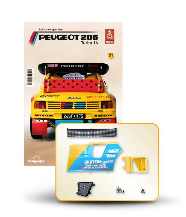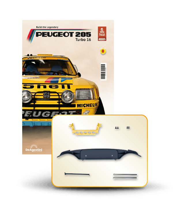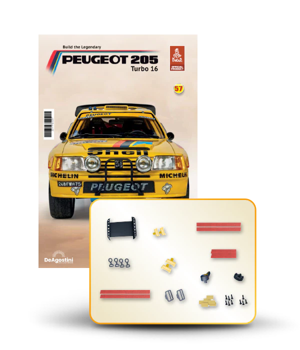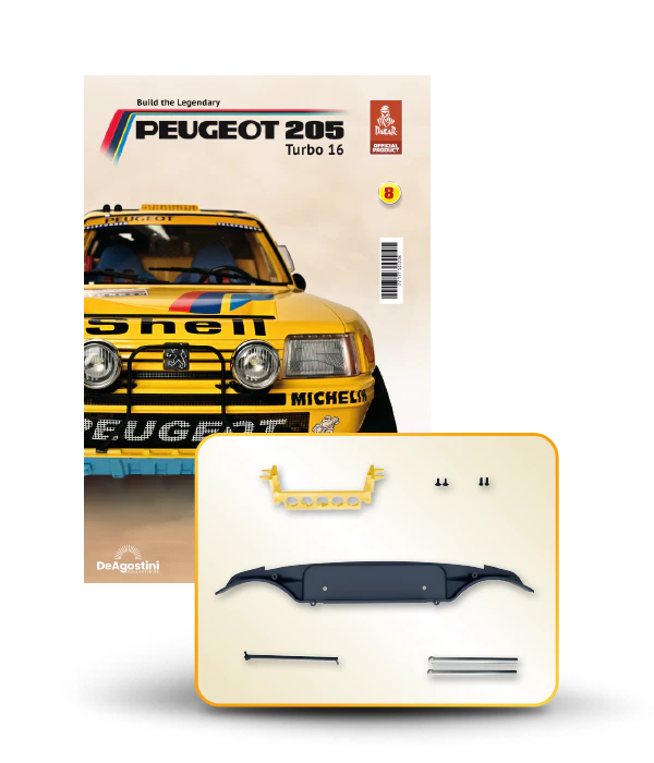 Jetzt kannst du dein eigenes 1:8-Modell des spektakulären Peugeot 205 Turbo 16 Grand Raid bauen, des Rallye Paris-Dakar-Siegers von 1987, wie er von Ari Vatanen und Bernard Giroux gefahren wurde. Dieses bisher noch nie auf dem Markt verfügbare Modell ist ein lange erwartete Neuzugang in der Welt des Modellbaus. Viel Spaß beim Zusammenbauen und anschließenden Ausstellen an einem Ehrenplatz bei dir zu Hause.