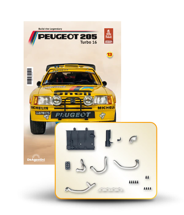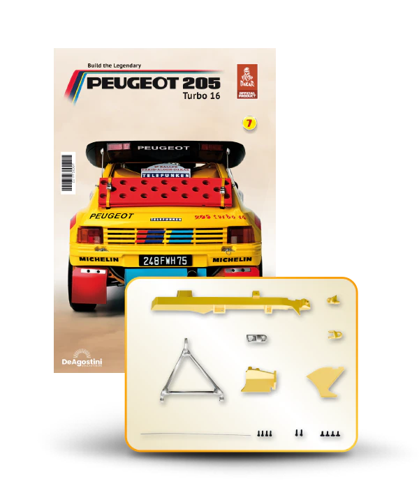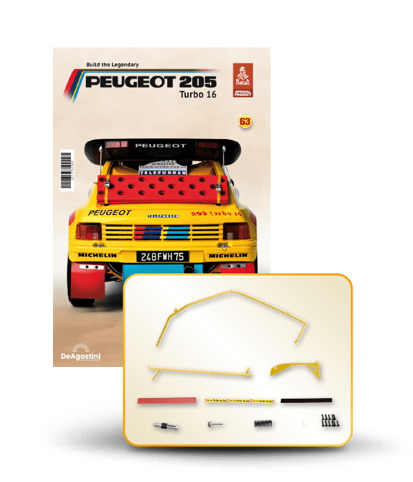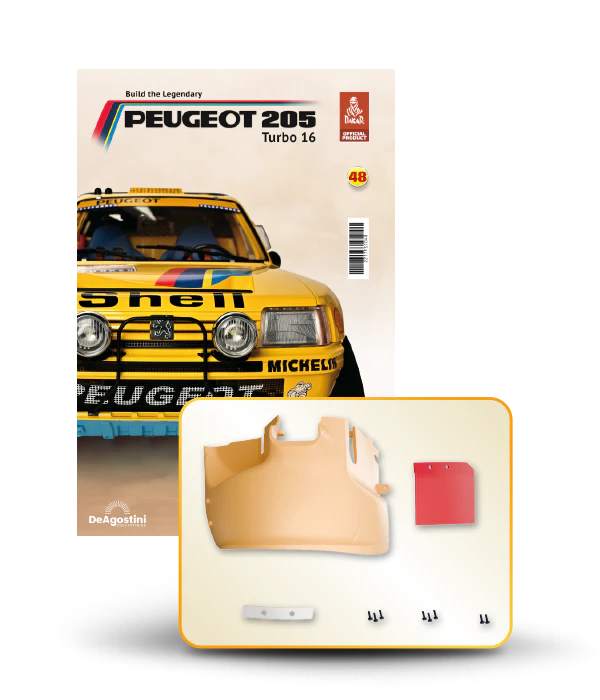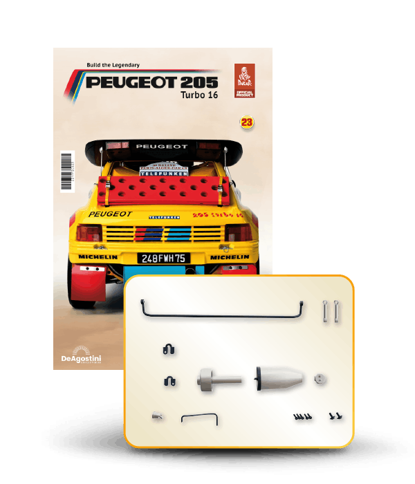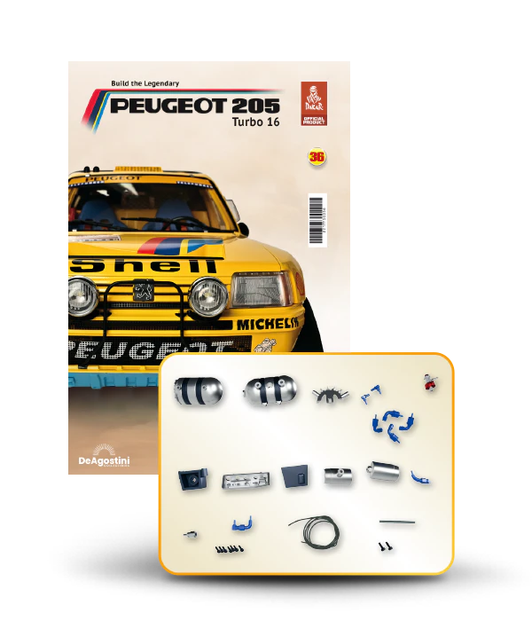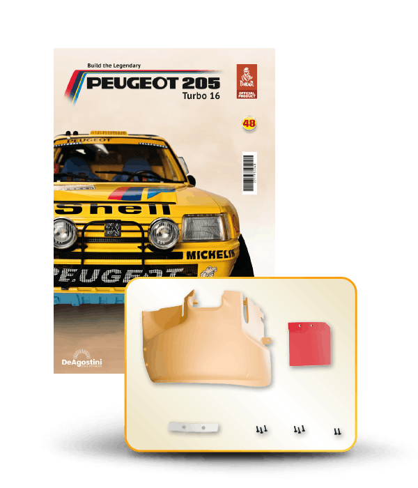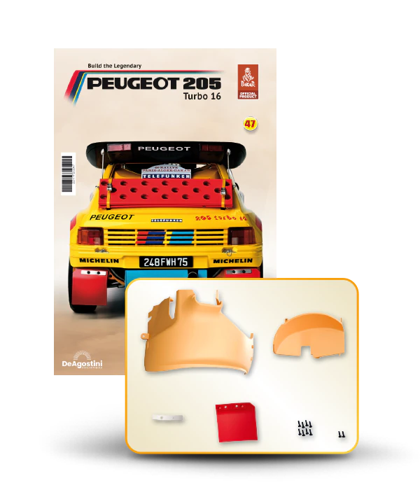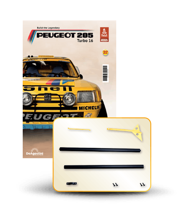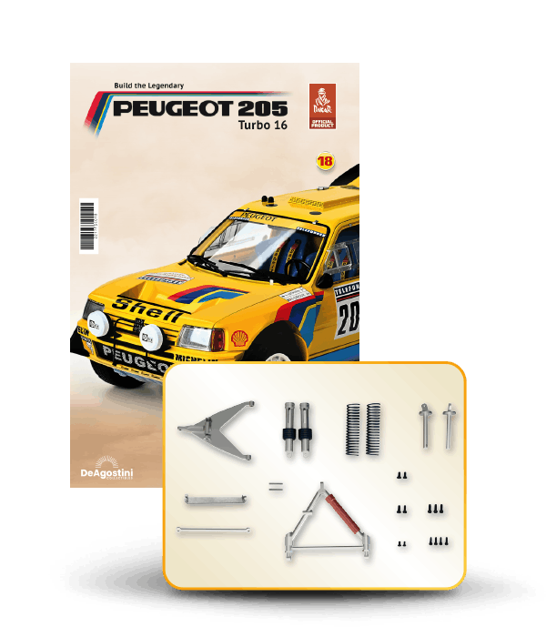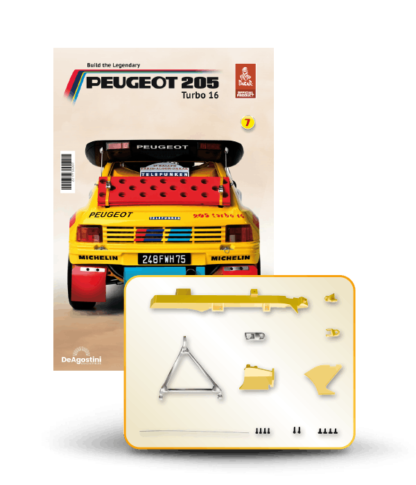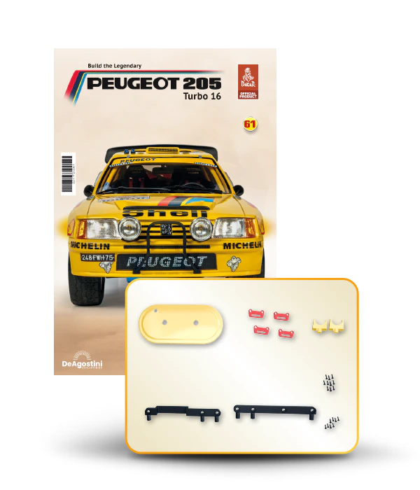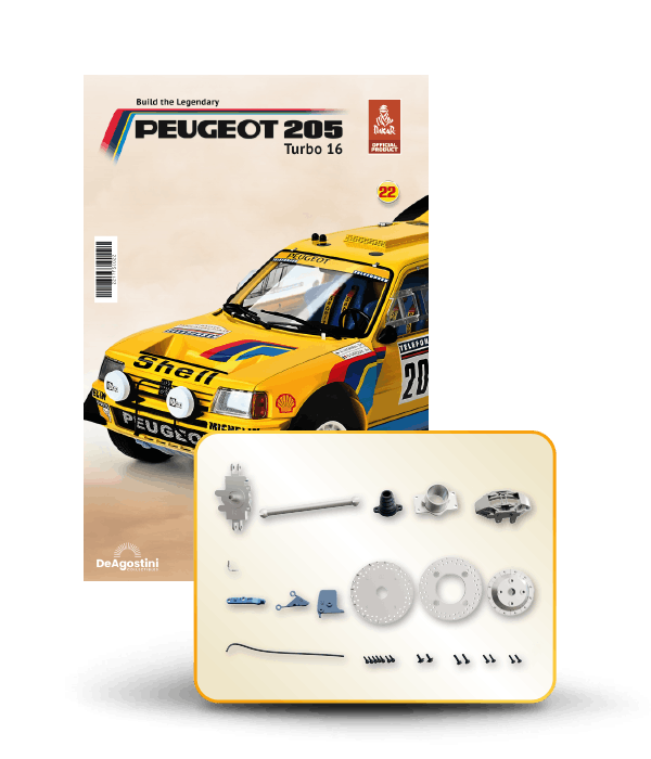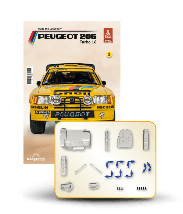 Jetzt kannst du dein eigenes 1:8-Modell des spektakulären Peugeot 205 Turbo 16 Grand Raid bauen, des Rallye Paris-Dakar-Siegers von 1987, wie er von Ari Vatanen und Bernard Giroux gefahren wurde. Dieses bisher noch nie auf dem Markt verfügbare Modell ist ein lange erwartete Neuzugang in der Welt des Modellbaus. Viel Spaß beim Zusammenbauen und anschließenden Ausstellen an einem Ehrenplatz bei dir zu Hause.