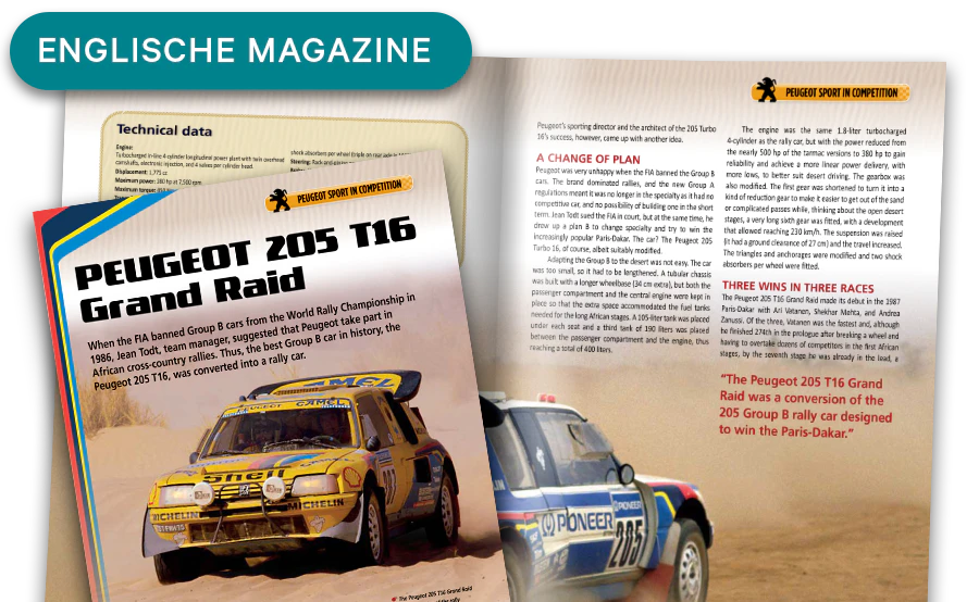 1987 begab sich Peugeot auf ein ganz neues Abenteuer und setzte sich das Ziel, einen der anspruchsvollsten Motorsportwettbewerbe der Welt zu gewinnen: die durch Frankreich, Algerien, Niger, Mali, Mauretanien und den Senegal führende Rallye Paris-Dakar. Um dieses ehrgeizige Ziel zu erreichen, entwickelte der französische Traditionshersteller ein Auto, das sich schließlich als unbesiegbar herausstellte: den Peugeot 205 T16 Grand Raid.