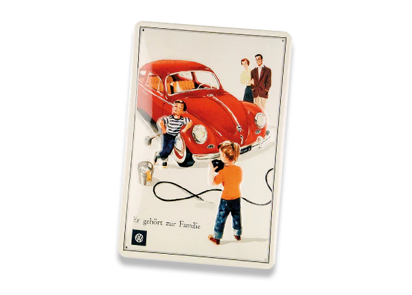 Ein Blechschild mit der Abbildung einer klassischen Volkswagen-Werbung.