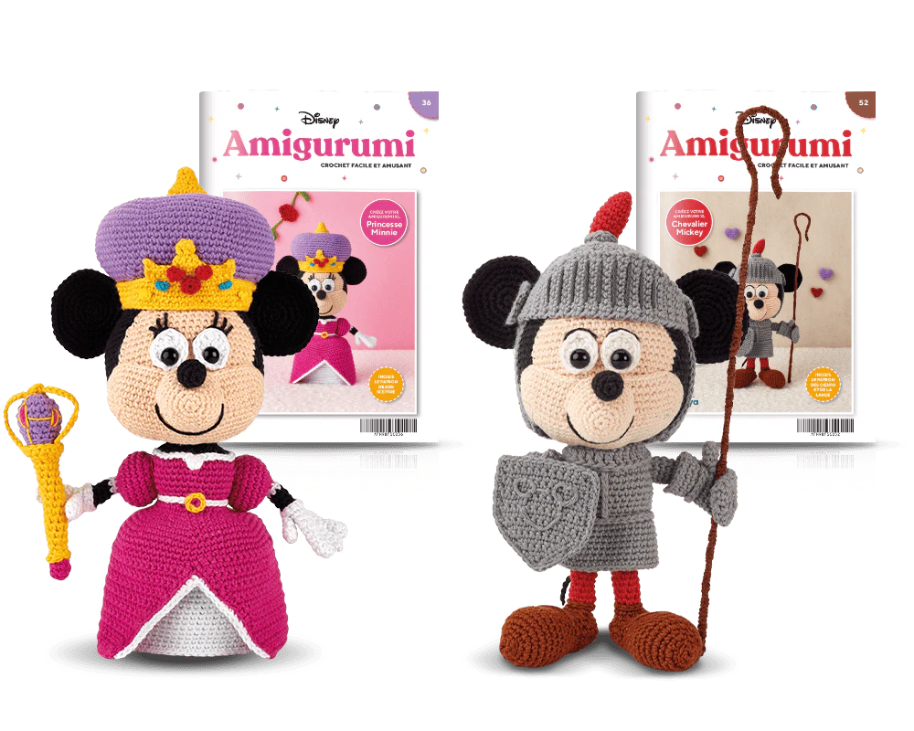 Au cours de la collection, vous recevrez trois numéros spéciaux pour créer des versions XL (environ 20cm) de vos personnages Disney préférés, parés de leurs plus beaux costumes. Chaque numéro spécial contiendra tout le nécessaire pour réaliser ces créations designées exclusivement pour la collection. Avec le premier, vous crochèterez Minnie vêtue de sa robe de princesse, et avec le second Mickey en chevalier.