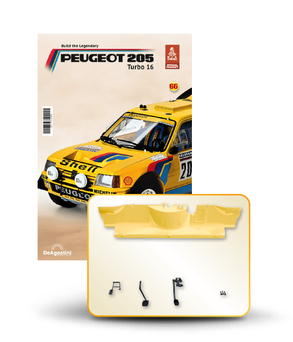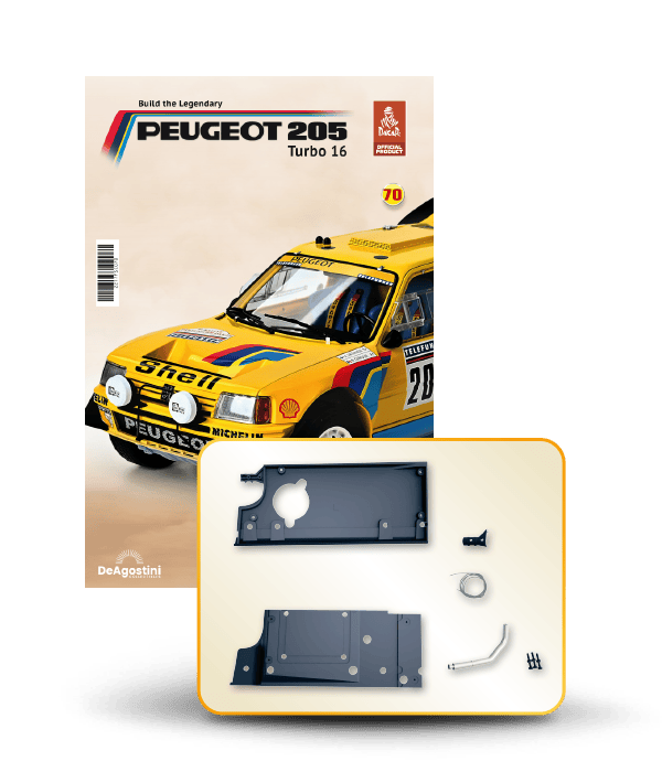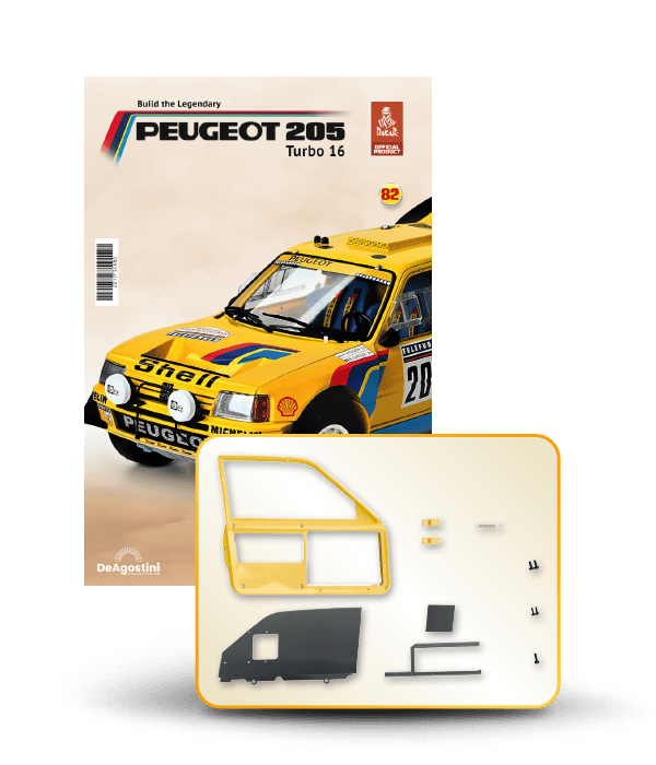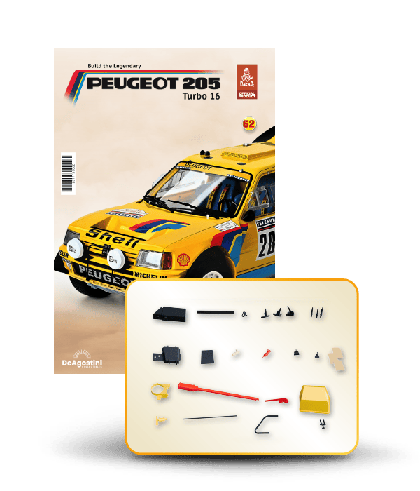 Now you can build your very own 1/8 scale model of the spectacular Peugeot 205 Turbo 16 Grand Raid, winner of the 1987 Paris-Dakar Rally, driven by Ari Vatanen and Bernard Giroux. This never-before-released model is a prestigious addition to the world of model making. Have fun assembling it and displaying it in a prominent place in your home.